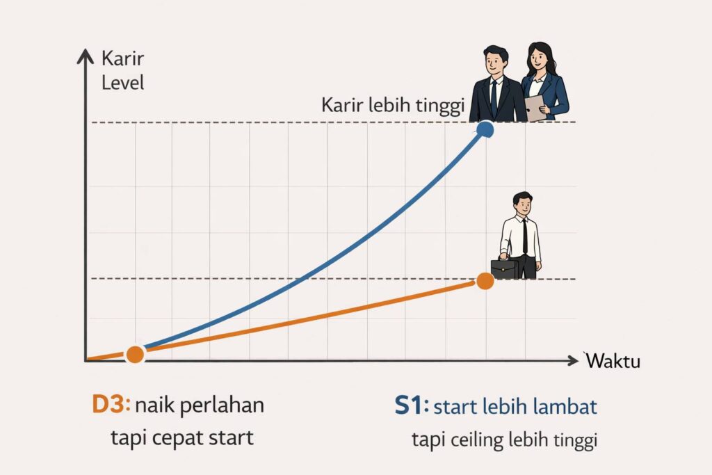 D3 lebih cepat kalau tujuanmu kerja segera dengan biaya minimal dan kamu sudah punya jaringan atau rencana bisnis keluarga. Tapi ceiling karir akan lebih rendah tanpa gelar S1.