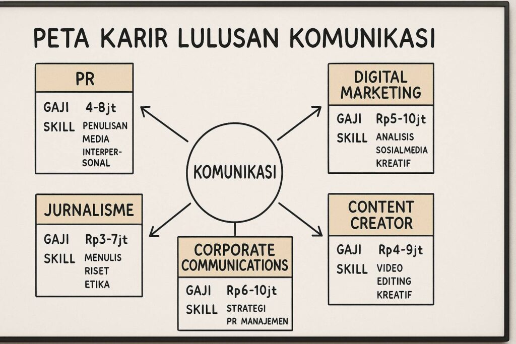 Tren terbaru: banyak lulusan komunikasi yang pivot ke UX Writing dan Product Communications di startup teknologi. Gaji bisa bersaing dengan lulusan informatika untuk posisi ini karena skill gabungan bahasa-teknologi sangat langka.